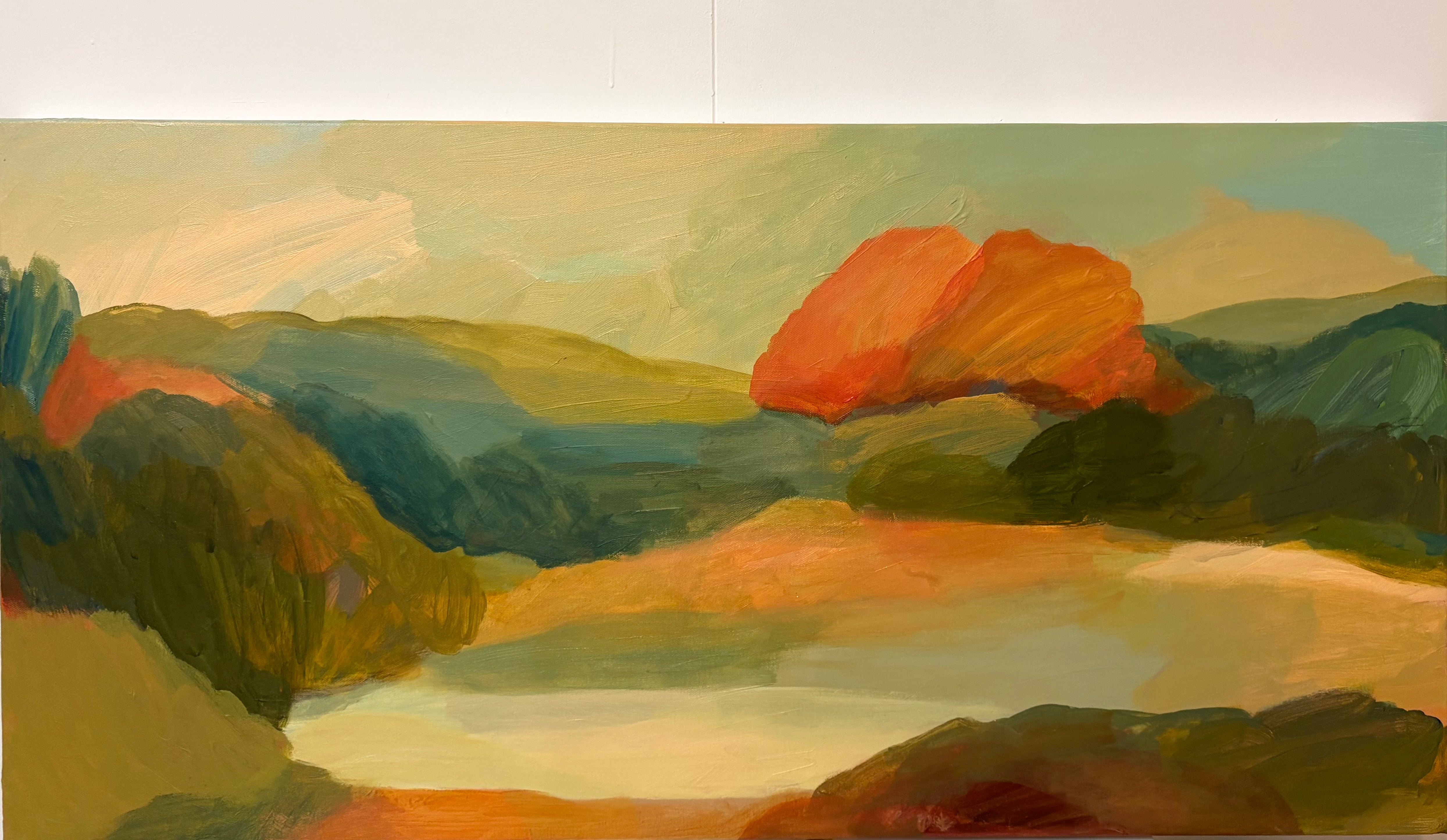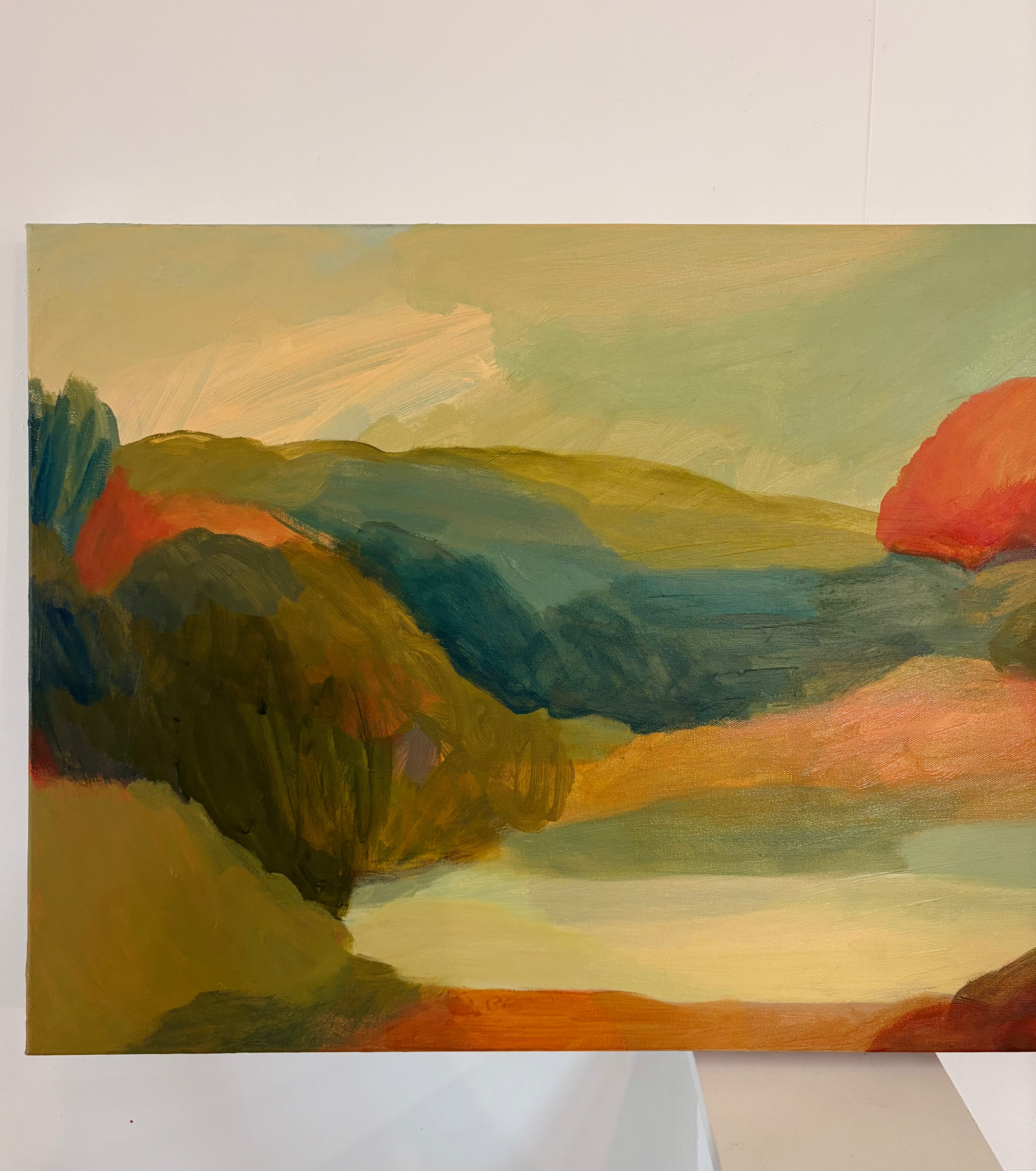 A new original landscape study on canvas. Painted in a subtle palette of soft warm greens, faded teals and peachy tones. Layered, organic shapes and a harmonious tonal colour scheme with pops of bright; this piece is settled and serene
